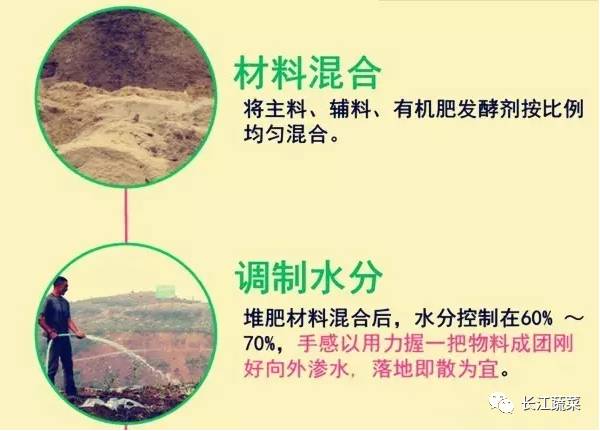 工序依次为材料混合、调制水分、建堆、封堆、翻堆。