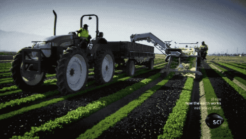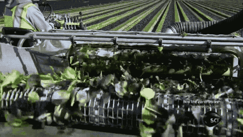因为这些主食材大多都是 30~45 天左右成熟,工人找一个合适的时间点,就可以用联合收割机同时进行多种蔬菜的收割。