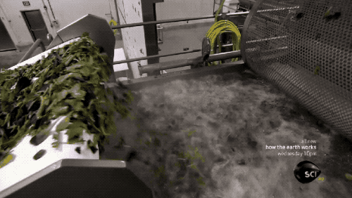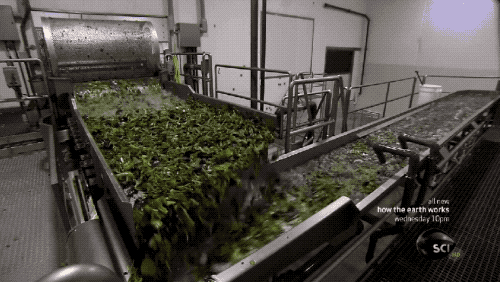 清洗的第一个步骤是用滚筒把蔬菜压进水里,做“浸入清洗”两次。