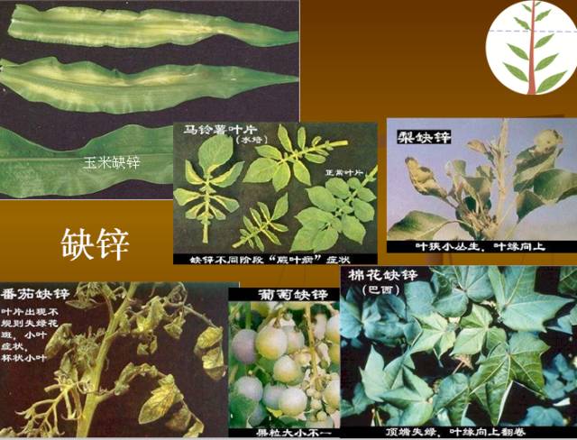 植物缺锌症状:老组织先出现缺锌时生长素含量下降,植物生长受阻,节间缩短,叶片扩展受抑制,表现为小叶簇生,称为小叶病或簇叶病。玉米缺锌出现白条症。