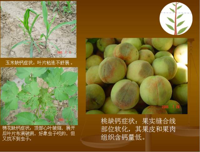 植物缺钙症状:顶芽、侧芽、根尖等分生组织易腐烂死亡,叶尖弯钩状,并相互粘连,干烧心、筋腐、脐腐等。