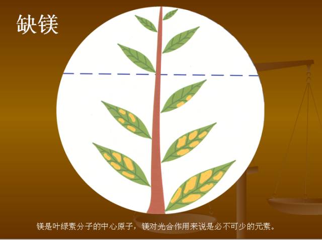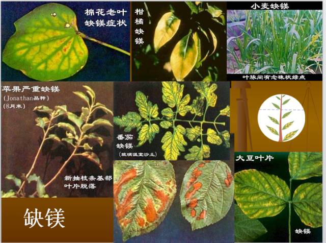 植物缺镁症状:Mg在植物体内易移动,缺镁时首先在老叶表现症状。老叶发生脉间失绿,叶脉保持绿色,形成清晰的绿色网状脉纹(禾本科缺镁时表现为脉间呈条纹状失绿),以后失绿部分由淡绿色转变为黄色或白色。