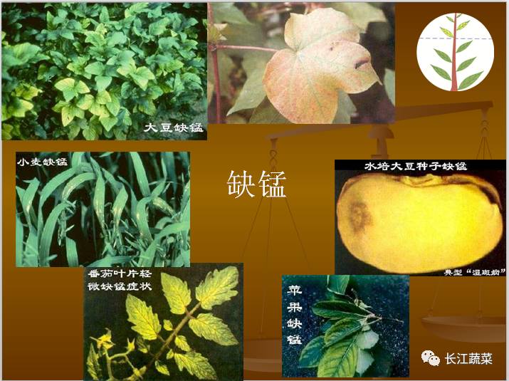 植物缺锰症状:症状从新叶开始,叶片脉间失绿,叶脉仍为绿色,叶片上出现褐色或灰色斑点,逐渐连成条状,严重时叶色失绿并坏死。