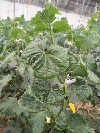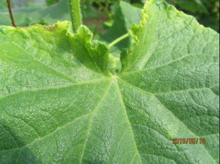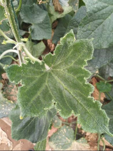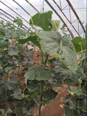 2、发生特点:在温室黄瓜生产中,春夏秋三个季节里最常见,而且从苗床小苗到成株均可发生,遇到连作和合适的气候条件(温度在摄氏18-27度,湿度45-90%左右),发生尤为严重,以局部出现中心点向四周蔓延的方式传播。