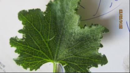 发展中后期:叶片稍上卷、叶缘变尖,叶脉变粗往主叶脉靠近收拢,叶片增厚墨绿色。如图(15、16、17)