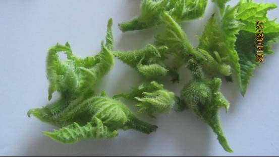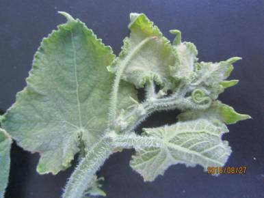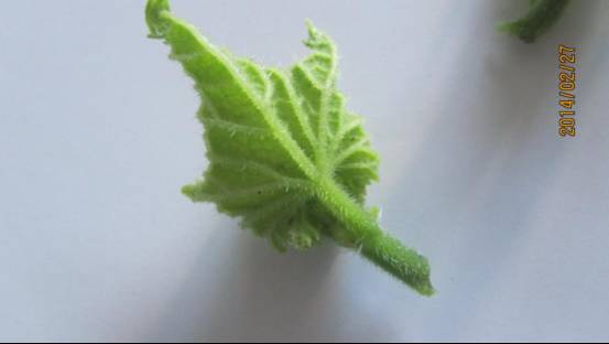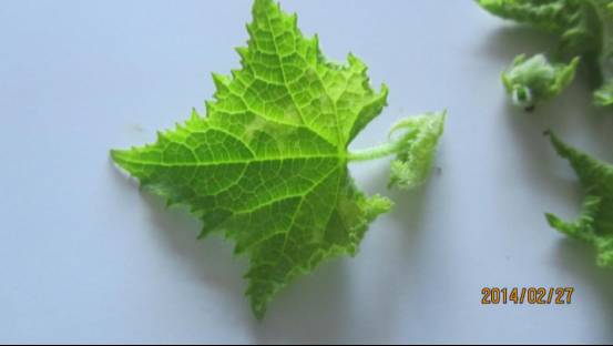 1、症状:同样是生长点附近的叶片出现症状,初期叶片变黄,叶缘上卷,但叶边不成钝型,叶脉正反明显。如图(11、12、13、14)