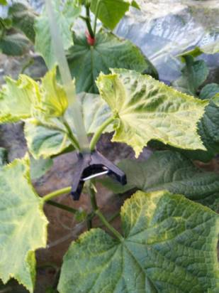 3、防治措施:尽量少用或不用激素沾黄瓜瓜胎,让其自然生长,如用药沾瓜胎,请避免高温30度以上操作,通好风;少用或不用含激素的便宜冲施肥。如果已出现症状,请抓紧时间浇清水,叶面喷洒氨基酸、腐植酸、海藻酸类以及含氮元素的叶面肥加以缓解症状。