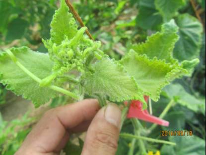 1、症状与发生特点:同样发生在生长点附近,但是叶片黄绿相间,叶脉时有断裂,不增粗;小叶叶缘上卷,叶面不平整。在田野中局部发生,往往有发病中心,往四周通过昆虫如白粉虱、烟粉虱、蚜虫等媒介传播,或人工劳动操作传播。如图23、24、25