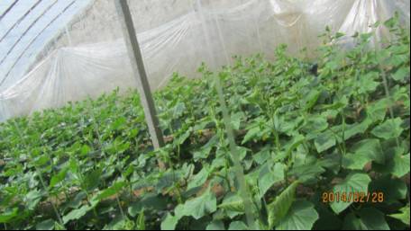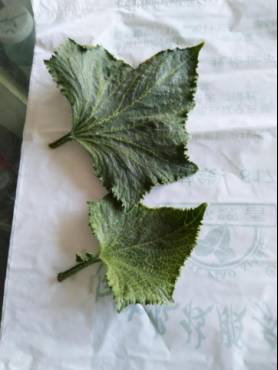3、防治措施:a、农业防治,铲除棚内杂草烧毁,防止虫源转入要栽植的瓜苗上,选择无螨黄瓜苗,如发现有疑似症状,可用手持放大50倍的放大镜查看,如发现螨苗立即剔除销毁;b、生物防治:有条件的大棚可施放捕食螨等茶黄螨的天敌;也可喷洒植物源类农药如0.5%藜芦碱可溶液剂500倍液或0.3%印楝素乳油防治;c、化学防治:提前防治,1.8%阿维菌素乳油2000-3000倍液、哒螨灵1500倍、20%丁氟螨酯1500倍等,7-10天一次,主要喷在嫩叶背面、嫩茎和生长点上,治疗之后的效果如图(9、10)