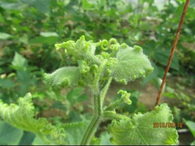 1、症状:发生在生长点附近的叶片上,起初叶片变黄、变厚变硬,油浸状,叶缘变钝上卷,正面小叶叶脉模糊,背面叶脉突出。(如图1、2、3)发展到中期叶片变得越来越硬越厚,叶面油亮变绿,叶缘变形更严重;(如图4、5)后期,生长点消失,叶片变成黄绿或墨绿。(如图6、7、8)