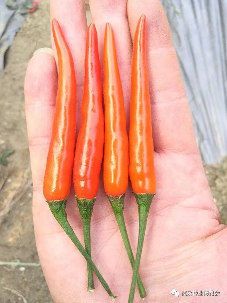 该品种属于单生朝天椒,早熟,杂交一代单生朝天椒,长约7-9厘米,直径约0.7-1厘米,硬度好,辣味强,单果重约6克。每亩定植1800株。