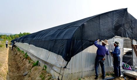 棚顶覆盖是在大棚四周自地面1 m高左右一段不盖遮阳网,也可在防雨棚基础上加盖遮阳网;平棚覆盖是利用固定式平棚或在田畦四角打桩拉平覆盖。在7月中下旬8月上旬强光高温时,选用黑色遮阳网,9:00~16:00覆盖;8月中旬后可用银灰色网覆盖,上午覆盖大棚东侧,下午覆盖大棚西侧。